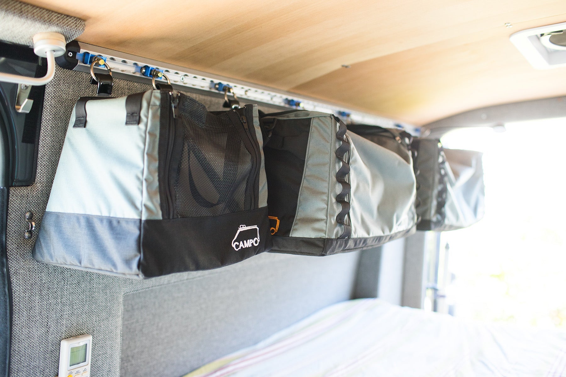 All bags have attached hooks for various mounting applications and they work in any and every van chassis: Sprinter, Transit, Promaster, Econoline, Eurovan, Vanagon, and more!  Be creative, the bag is yours!