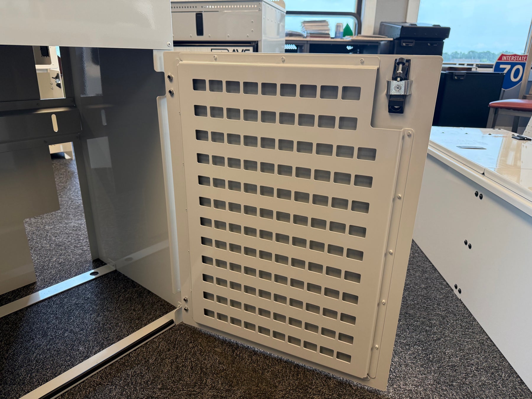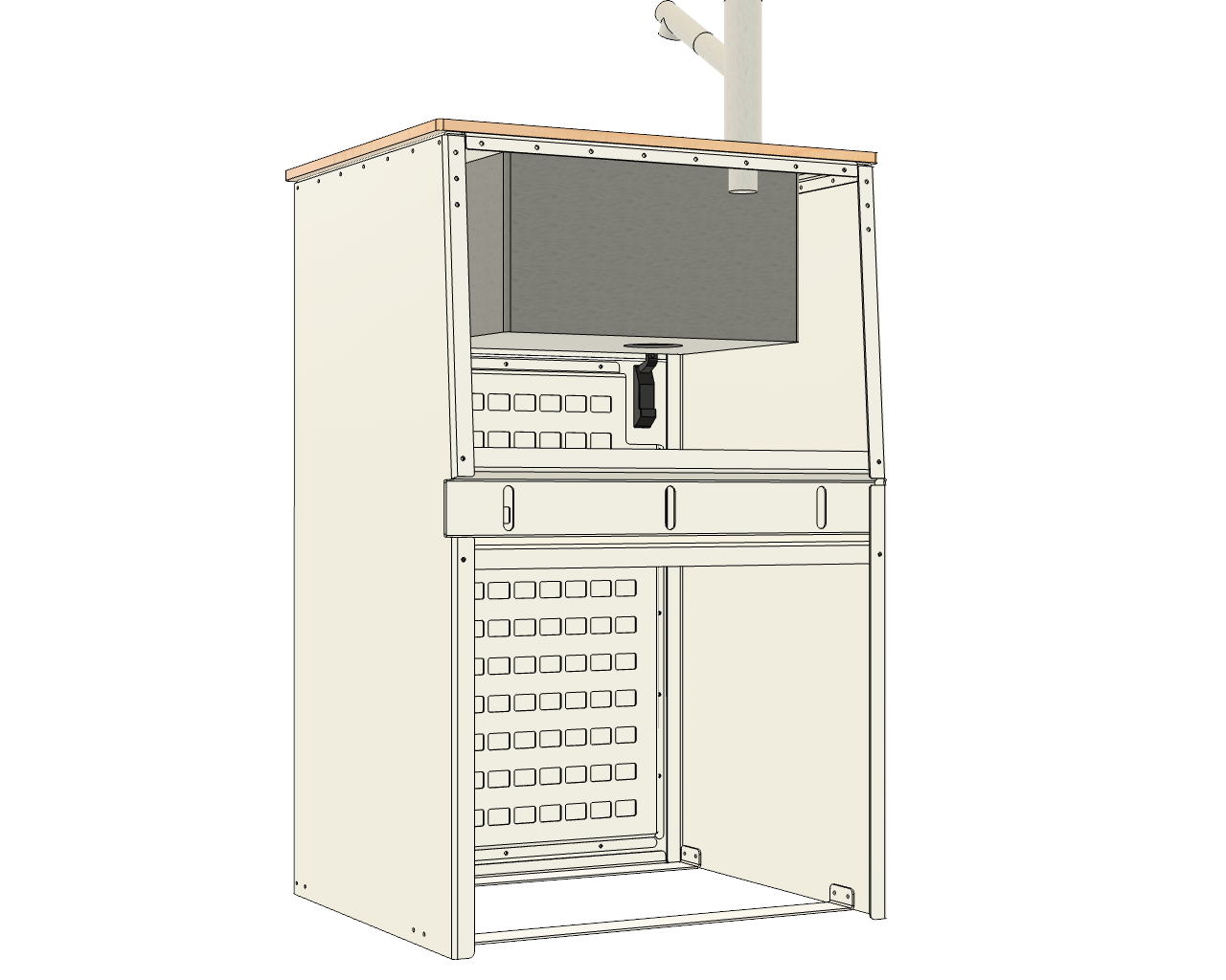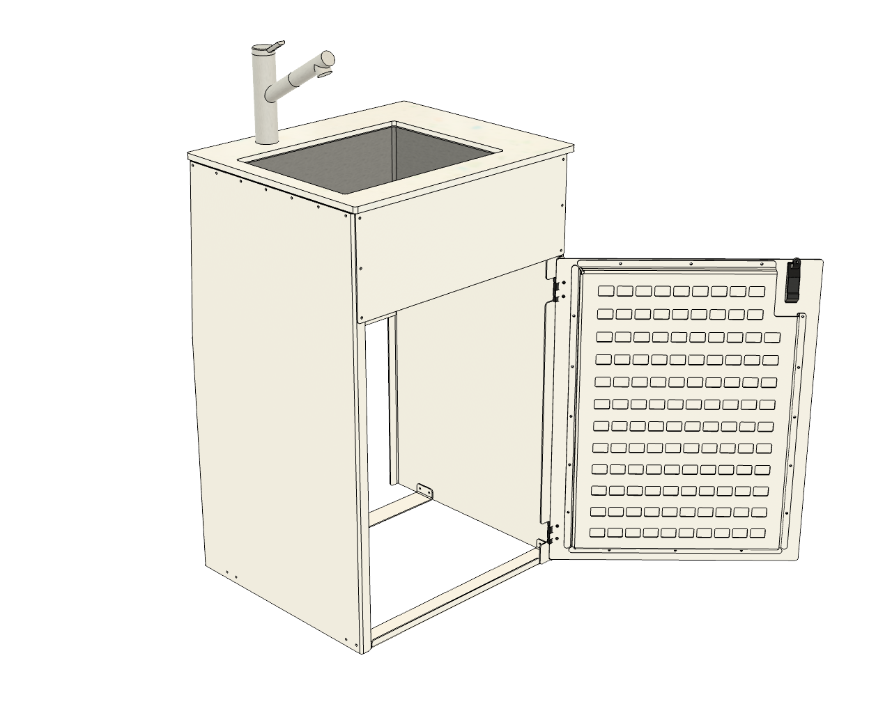 Ample Storage: A large cabinet door features MOLE grid storage for organizing cleaning supplies, while the under-sink area provides plenty of space for bulk products and waste bins.