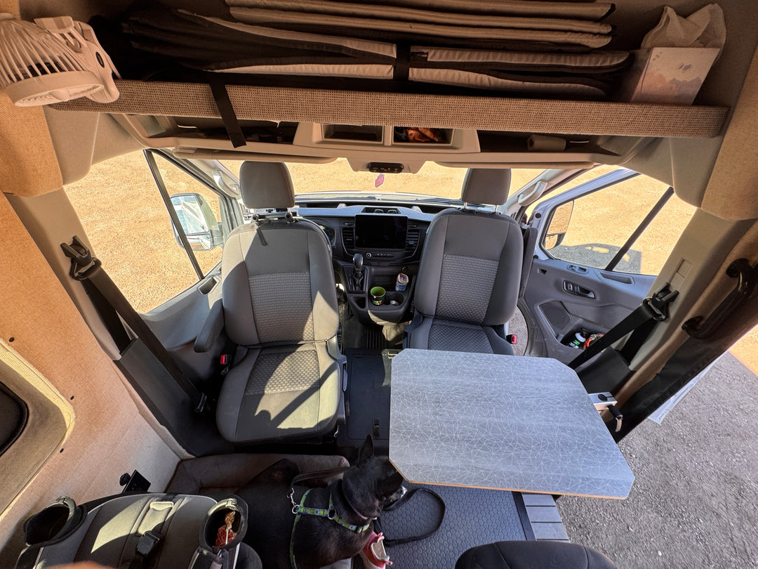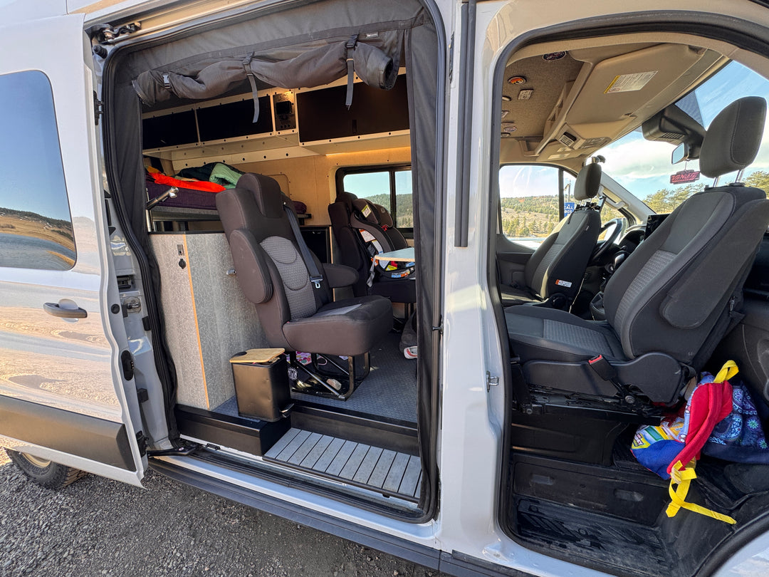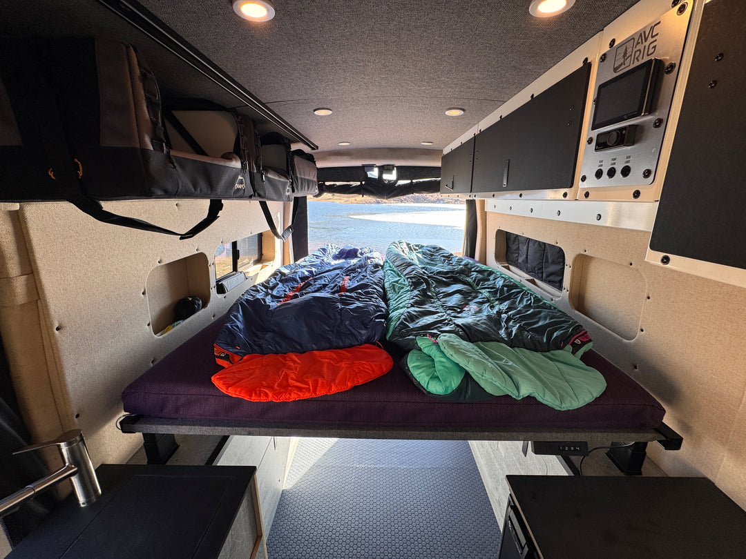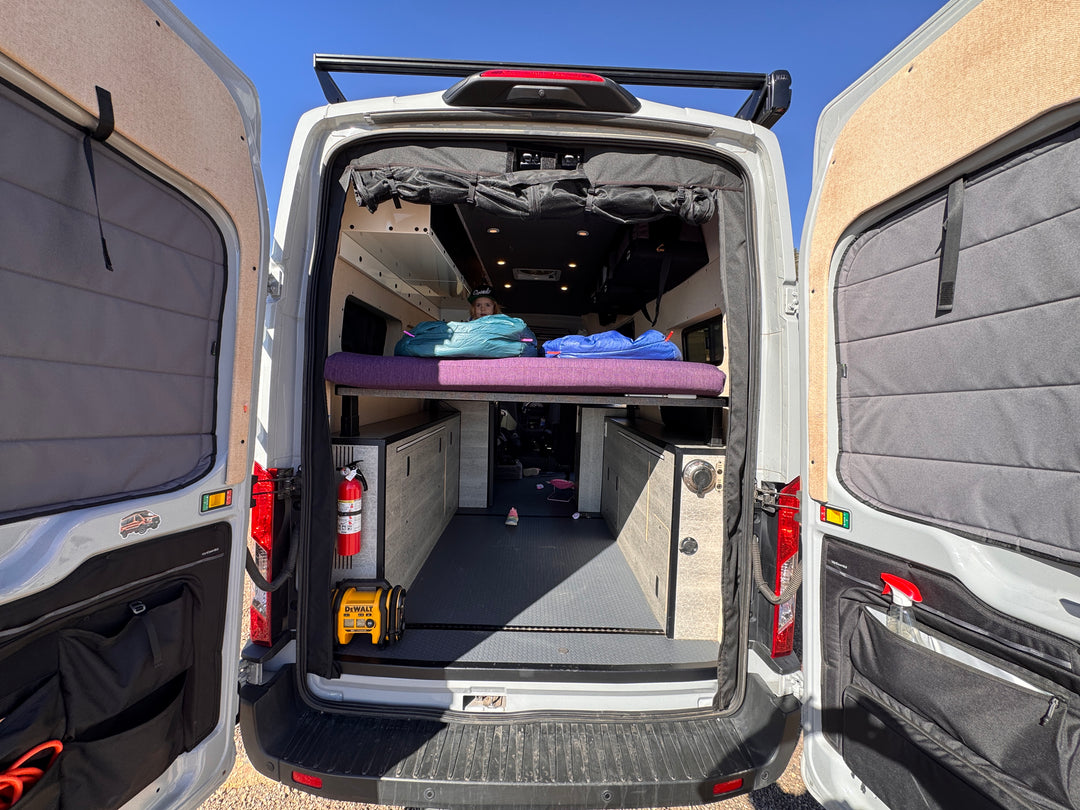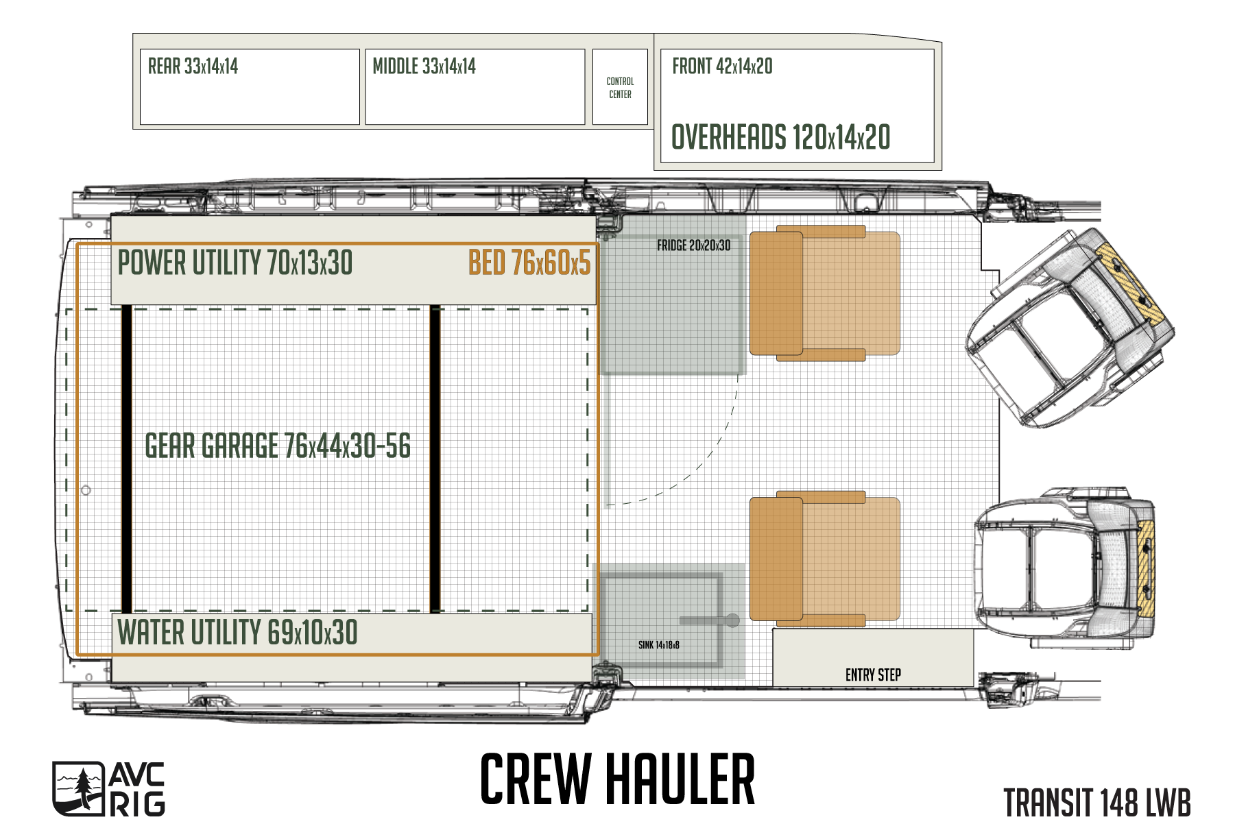 The Crew Hauler started as a variation of the Gear Hauler build. We took the garage of the Gear Hauler and reconfigured the front half of the van to prioritize a crew of 4. Using the front two swivel seats this opened the front of the van into a seating area for all passengers. We moved the kitchen into the center and split the sink from the fridge to keep the bed and garage a priority.